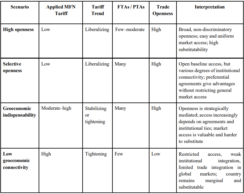 In an environment characterized by geopolitical fragmentation and the increasing use of trade policy for strategic purposes, openness is no longer uniform or purely liberalizing. Instead, many countries are pursuing strategies that combine selective openness with greater control over market access. Geoeconomic indispensability emerges when countries appear less open along some dimensions (such as MFN tariffs), while becoming more institutionally connected through agreements, making access to their markets more valuable, selective, and difficult to substitute.